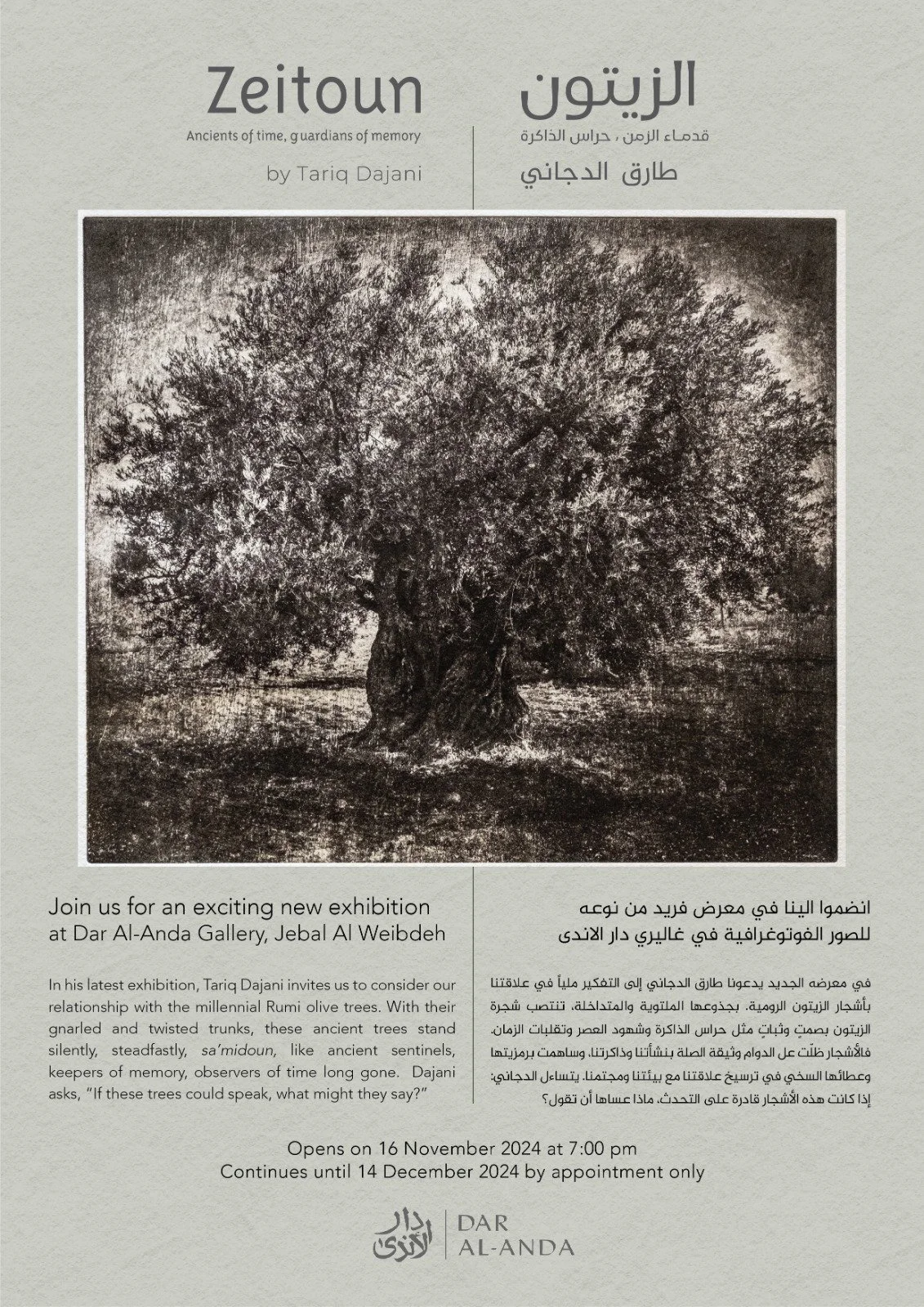 في معرضه الجديد "رحلتي مع شجرة الزيتون" يدعونا طارق الدجاني إلى التفكير ملياً في علاقتنا بأشجار الزيتون الرومية التي احتضنتها بلاد الشام منذ آلاف السنين. إنها أقدم المخلوقات المعاصرة والمقيمة في حياتنا وذكرياتنا البعيدة منذ فجر التاريخ ومدونات الشعوب.